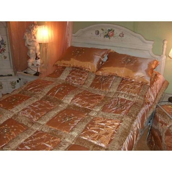 • Gruba Narzuta na Łóżko w Kolorze Łososia z Satynowym Przeszyciem i Haftem - zestaw z Poduszkami