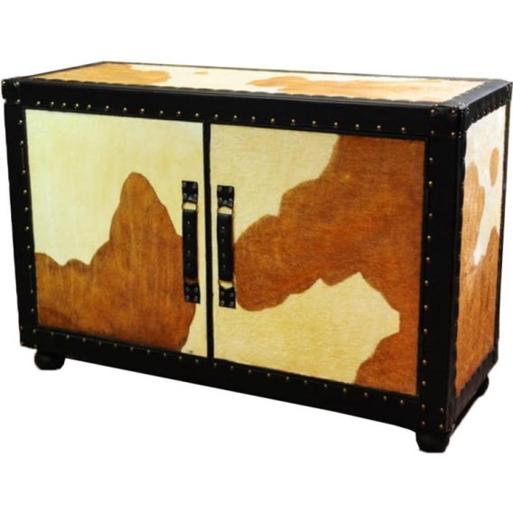 • Komoda Dwudrzwiowa Sierść Cielaka w Kolorze Biało-Brązowym z Wykończeniem Skórzano-Ćwiekowym